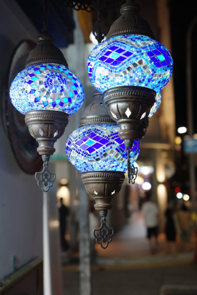 This evening we caught the MRT into Kampong Glam. The streets were alive with people… restaurants spilling out onto the pavements, small rug, lamp and bowl hawkers, and the streets buzzing with chatter and clatter. Bustling, noisy, colourful.