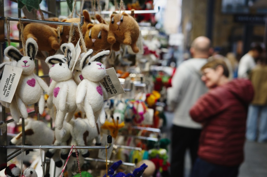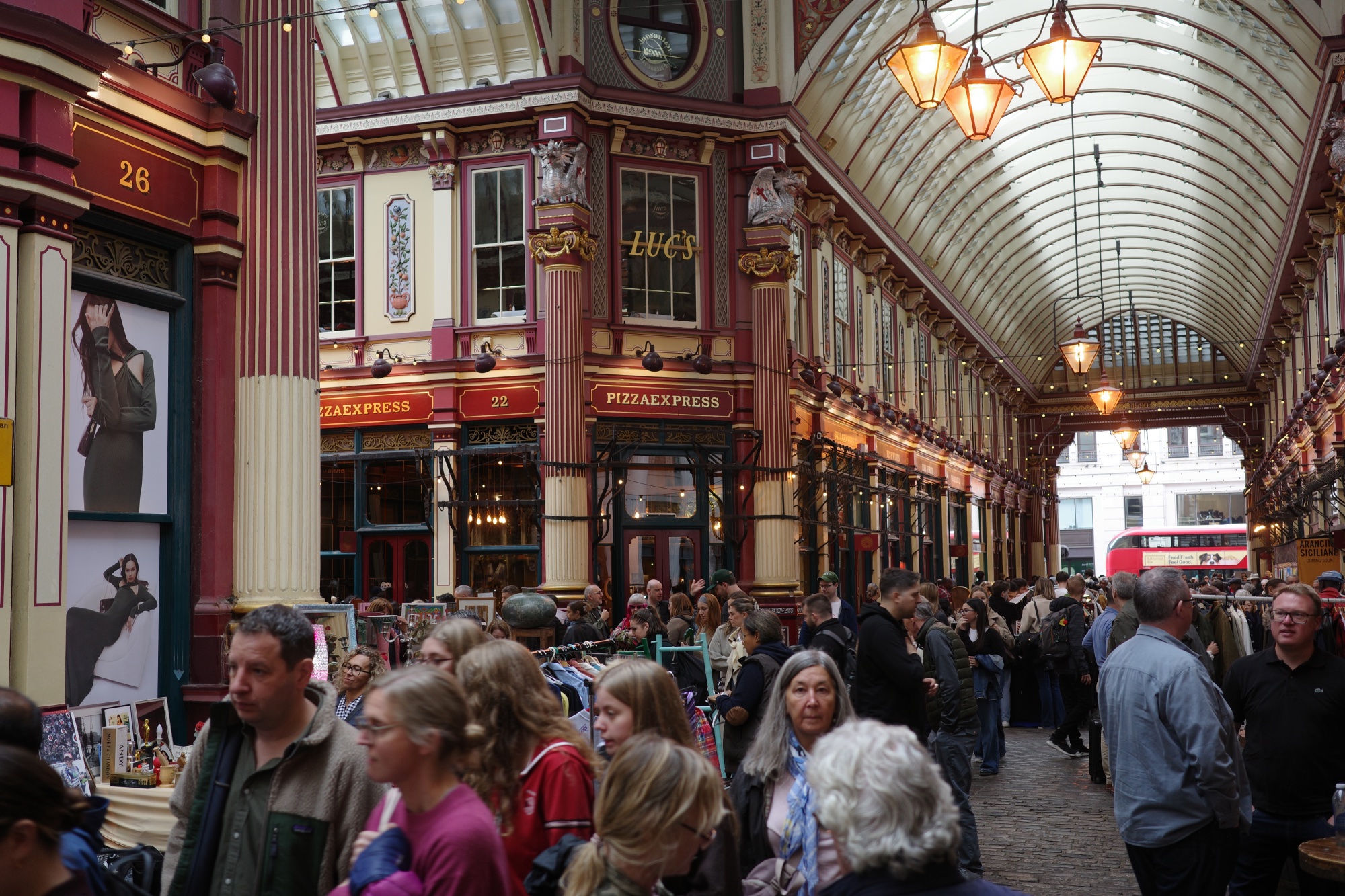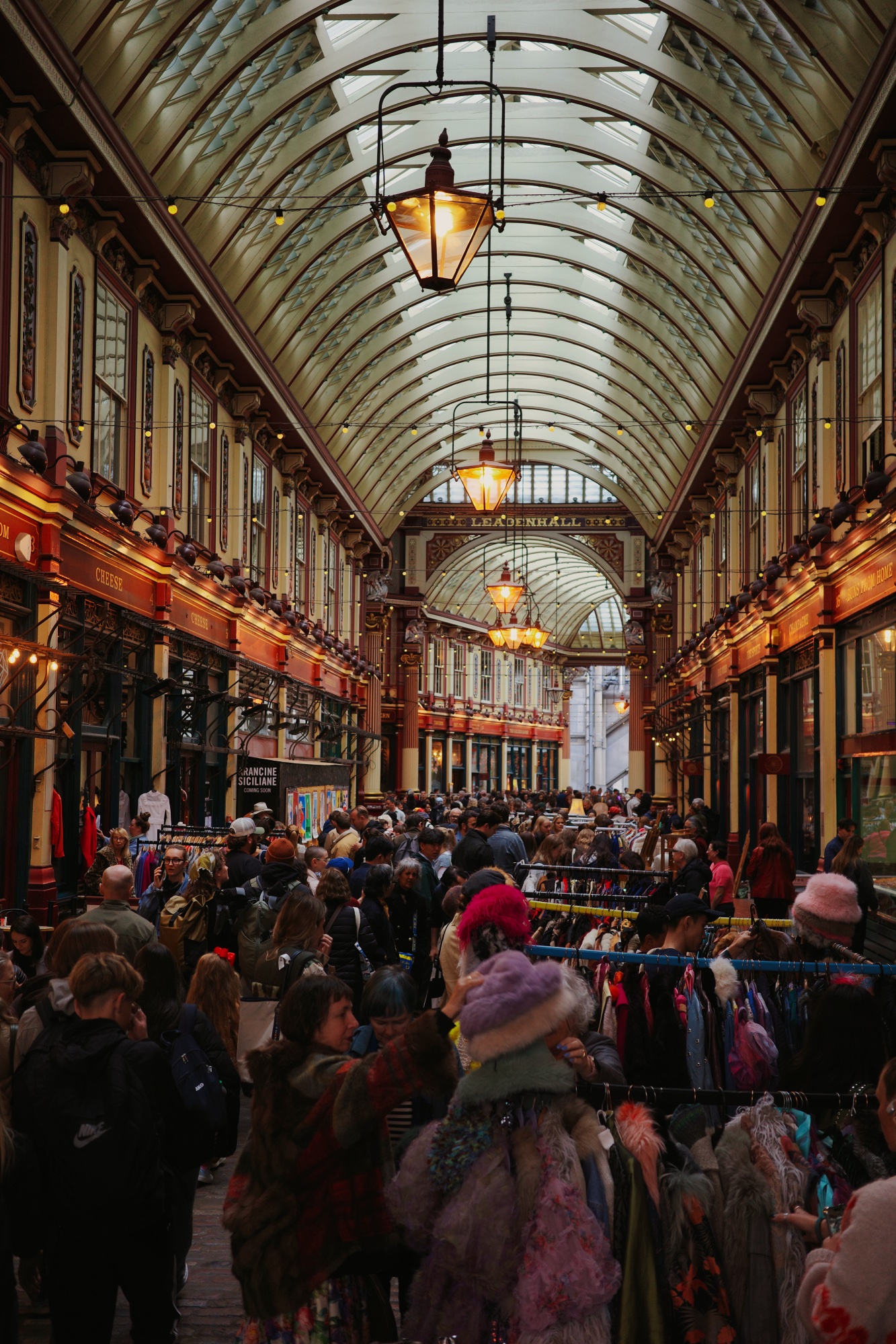 From there we strolled through Spitalfields, gazing at the cheap wares on Petticoat Lane before stopping for a bagel and coffee at the Spitalfields Market proper. Then it was on through the city… a hotchpotch of magnificent stone, glass and steel buildings crammed into a few blocks. Then Leadenhall Market, tucked beneath the shadow of the Lloyd’s building… all Victorian ironwork, cobbles and arcades. Grand, theatrical, and very London. Amongst the pubs and stalls of second-hand clothing, L triumphantly unearthed a vintage leather jacket.