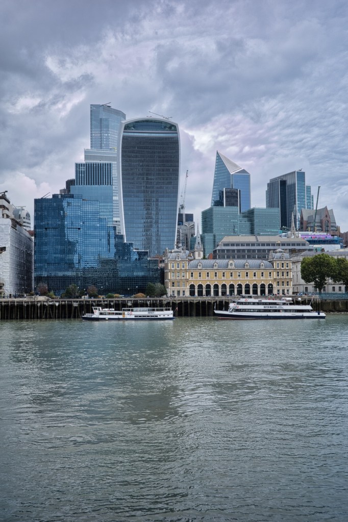 A Tardis shoot was underway next to the Thames (so I guess next season is officially happening). We crossed back over the bridge, jostled through the Tower crowds, then looped the north bank towards St Paul’s and on into the 70s chic of the Barbican. By then the rain had settled.